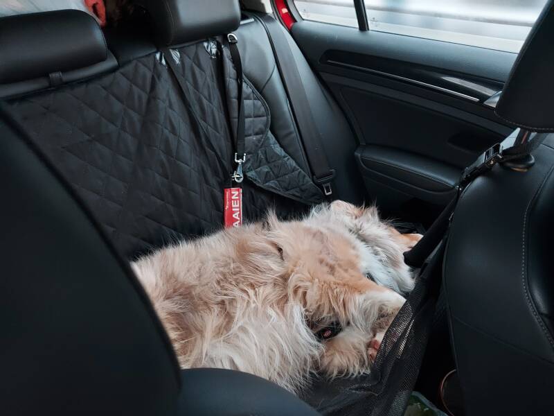 Na het rondje stad kwamen we weer bij de auto. Sommige honden mochten nog mee naar het terras maar voor ons was het genoeg. Pap bleef bij mij in de auto en mam ging nog even mee. Pap ging wat lekkers halen voor zichzelf bij het kraampje op de parking, dat had hij wel verdiend. Ik was zo moe, dat ik niet eens bedelde ondanks dat het heerlijk rook.